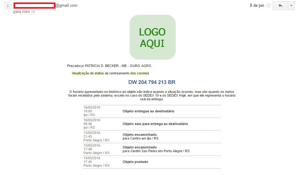 Quando digitado o email e/ou número do telefone celular no ato da pré postagem o destinatário receberá E-mails e alertas via SMS com o status do sistema de rastreamento dos Correios conforme os modelos acima, toda vez que o status for modificado o destinatário receberá um novo E-mail e/ou um novo alerta via SMS